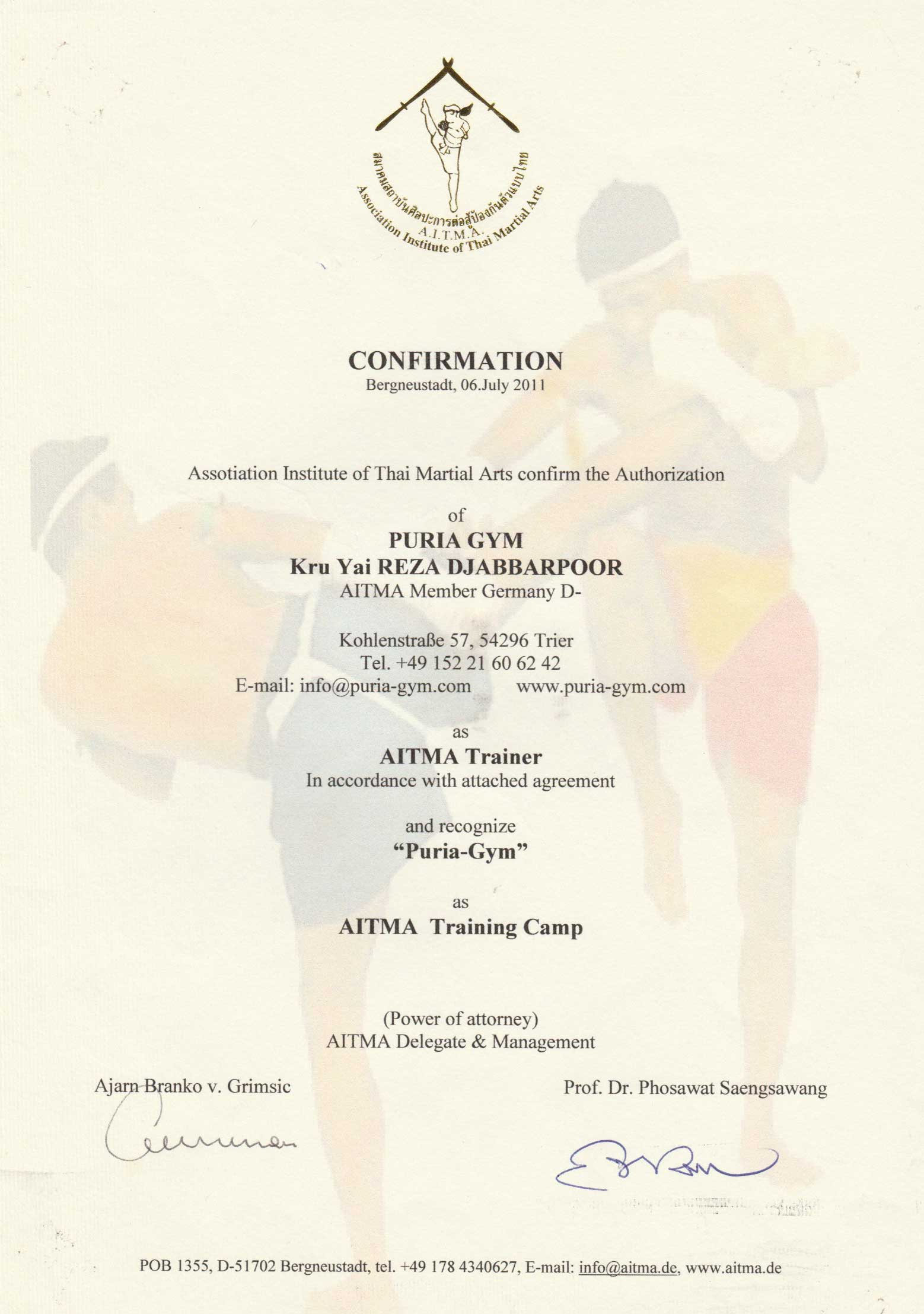 - Trainer: RIP Grand Master Mohammad Agha Towhidi / Grand Master Dr. Pho / Senior Grand Master Dr. Vichit (höchsten Meistergrad im Krabikrabong weltweit)
